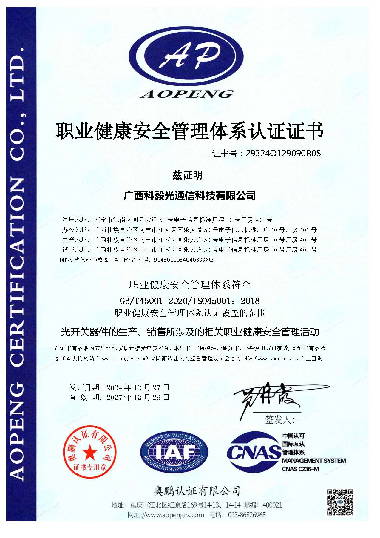 職業(yè)健康安全管理體系認(rèn)證證書